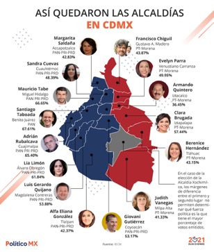 MORENA se descarriló en la Ciudad de México. De acuerdo con los resultados de los conteos rápidos serían seis alcaldías las que el partido en el gobierno perdería ante la alianza de los partidos Acción Nacional, Revolucionario Institucional y de la Revolución Democrática.