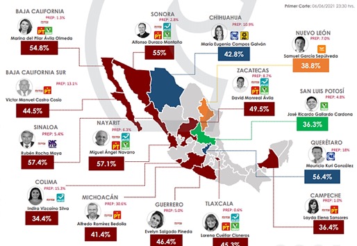 En los estados avanza en 11 de las 15 gubernaturas: Baja California, Baja California Sur, Colima, Nayarit, Sinaloa, Sonora Zacatecas, Guerrero, Tlaxcala, Michoacán y Campeche.