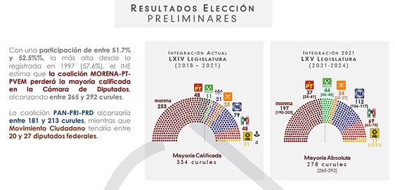De acuerdo, a las proyecciones del Instituto Nacional Electoral (INE), Morena, tendría entre 190 y 203 curules en la Cámara de Diputados. Esto le permitiría mantener con sus aliados una mayoría, pero INSUFICIENTE para emprender cambios radicales.