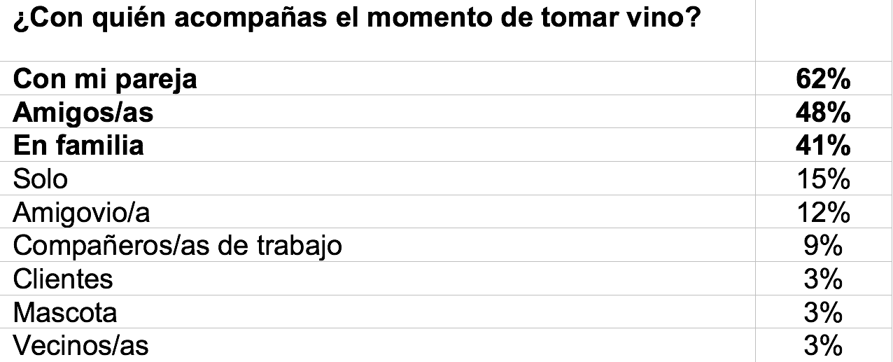Es también considerado un buen acompañante en momentos u ocasiones especiales, principalmente considerado así por mujeres, mientras que los hombres perciben que la convivencia con amigos es el momento ideal de consumo.