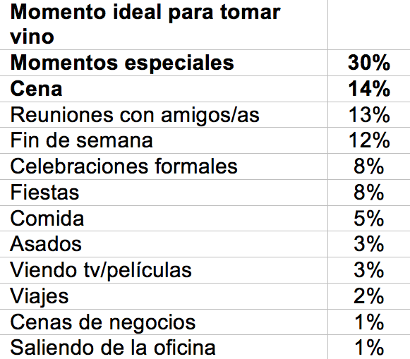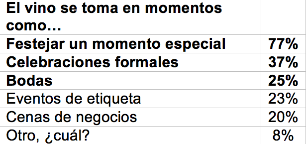 Otros momentos de consumo son: celebraciones formales (como una boda) y reuniones cotidianas (como cenas).