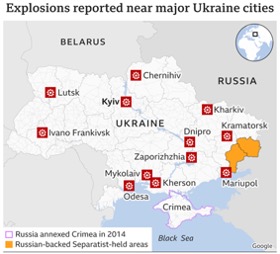 Solo unos minutos después de su discurso hubo grandes explosiones en varios puntos del este de Ucrania, desde Sloviansk y Kramatorsk a Járkov, a 30 kilómetros de la frontera rusa; incluso en Kiev, la capital. Bombas y explosiones se empezaron a reportar en varias ciudades del país, más allá de los territorios del este de Ucrania citados por el mandatario ruso.