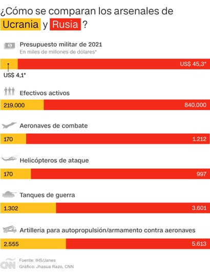 Rusia tiene más poder de fuego militar que Ucrania, que cubre la tierra, el aire y el mar.