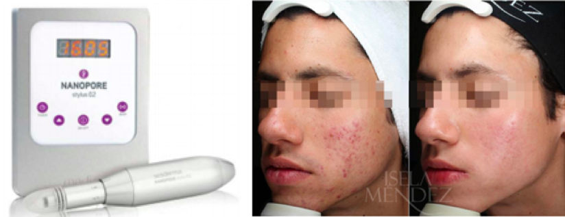 Micropunción eléctrica. (Nanopore) con el cual se realizan micropunciones logrando realizar múltiples microcanales que quedan abiertos por 10 minutos para introducir principios activos como factores de crecimiento de fibroblastos.