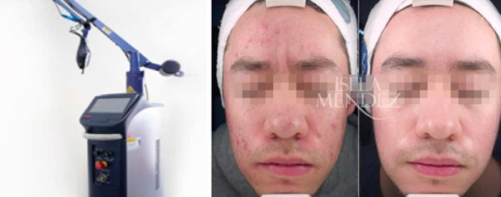 Láser CO2 fraccionado: es el gold estándar para cicatrices, rejuvenecimiento, fotodaño, queratosis actínicas, este tratamiento es por medio de un láser de carbono, el láser realiza macrozonas termales un promedio de 100 por cm2, llegando hasta la dermis ocasionando un calentamiento de más de 70 grados centígrados, la recuperación es de 10 días con unos puntitos en la cara,(si se puede ir a trabajar con protector solar) podemos sellar el tratamiento con factores de crecimiento.