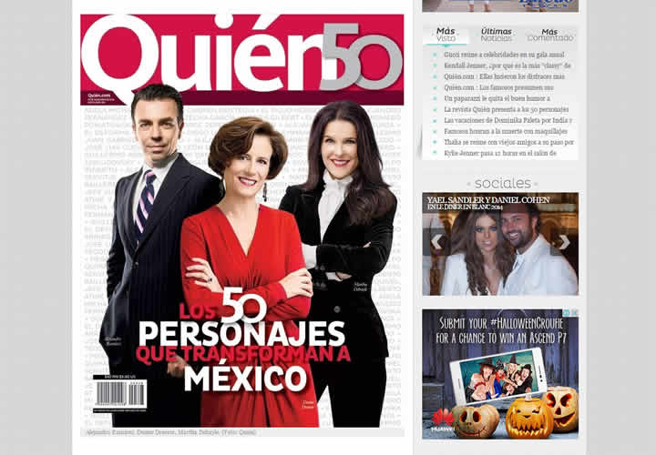 Martha Debayle, Denise Dresser, Alejandro Ramírez, Carmen Aristegui, Elena Poniatowska, Alejandro Fernández, Zélika García, Guillermo Arriaga, Miguel “El Piojo” Herrera y el portal de internet ElDeforma.com encabezan la lista 2014 de “Quién 50, los personajes que transforman a México”.