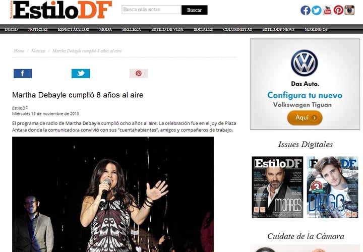 Martha Debayle transmite su programa de lunes a viernes por W Radio de diez de la mañana a una de la tarde.
