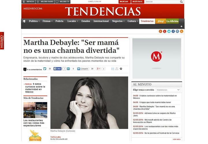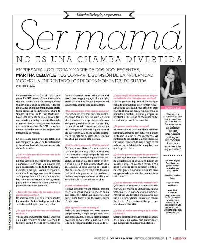 La maternidad cambió su vida por completo. En 1997 comenzó las cápsulas bbtips en Televisa para dar consejos sobre maternidad y crianza infantil. A través de los años este pequeño proyecto creció tanto como sus hijas Antonina, ahora de 18 años, y Camila, de 15. Hoy, Martha Debayle está al frente de MMK Knowledge, un emporio que incluye la marca bbmundo y la revista Moi, un programa en W Radio, y otro de televisión. En 2013, la revista Forbes la nombró una de las mujeres más influyentes de México.