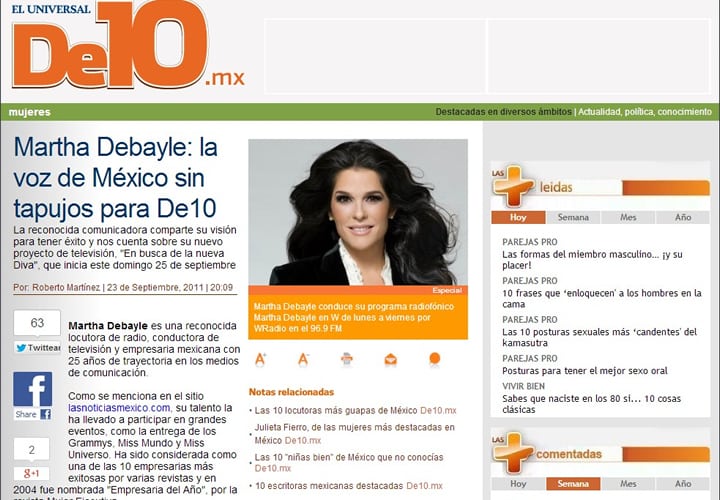 Ella levanta su voz de lunes a viernes de 10:00 a 13:00 horas en W Radio y se dirige a hombres y mujeres que quieren ir más allá de los estereotipos sociales. Y aunque es melómana y bien podría tener un programa de música, “aún siento que tengo tantas cosas que decir y necesito el espacio para dar y expresar. Hoy en día la gente requiere mucha verdad, mucha información, precisa entenderse y entender las cosas para ser más felices”.