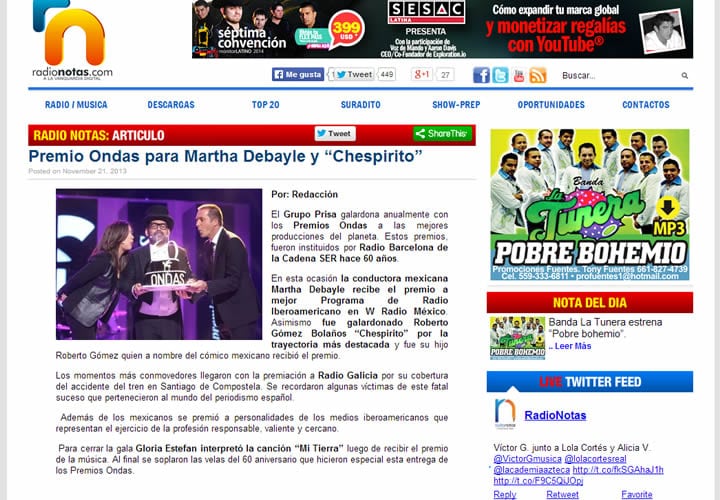 El Grupo Prisa galardona anualmente con los Premios Ondas a las mejores producciones del planeta. Estos premios, fueron instituidos por Radio Barcelona de la Cadena SER hace 60 años. En esta ocasión la conductora mexicana Martha Debayle recibe el premio a mejor Programa de Radio Iberoamericano en W Radio México. Asimismo fue galardonado Roberto Gómez Bolaños “Chespirito” por la trayectoria más destacada y fue su hijo Roberto Gómez quien a nombre del cómico mexicano recibió el premio.