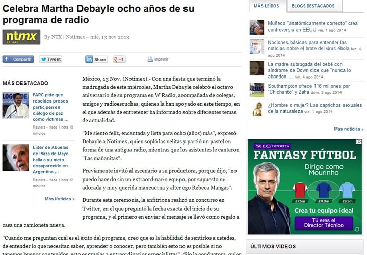 México, 13 Nov. (Notimex).- Con una fiesta que terminó la madrugada de este miércoles, Martha Debayle celebró el octavo aniversario de su programa en W Radio, acompañada de colegas, amigos y radioescuchas, quienes la han apoyado en este tiempo, en el que además de entretener ha informado sobre diferentes temas de actualidad.