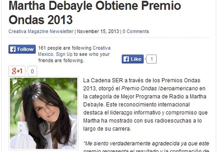 La Cadena SER a través de los Premios Ondas 2013, otorgó el Premio Ondas Iberoamericano en la categoría de Mejor Programa de Radio a Martha Debayle. Este reconocimiento internacional destaca el liderazgo informativo y compromiso que Martha ha mostrado con sus radioescuchas a lo largo de su carrera.