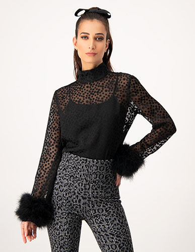 Polka Dot Top with Feather Trim in Black