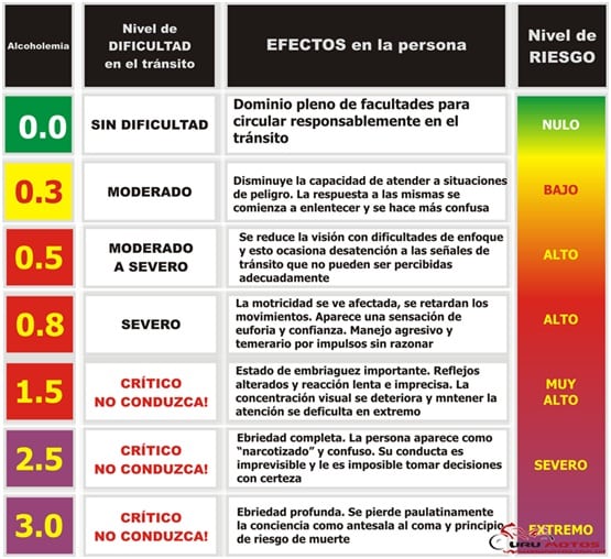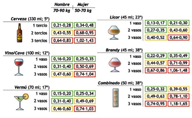 - 0,5 gr/l: euforia, sobrevaloración de facultades y disminución de reflejos 1 gr/l: desinhibición y dificultades para hablar y coordinar movimientos