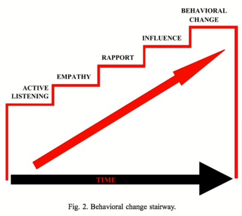 Estos son basados en el “Modelo de Escalera de Cambio de Comportamiento” (Behavioral Change Stairway Model, desarrollado por la unidad de negociación de rehenes del FBI para lograr la resolución de conflictos.