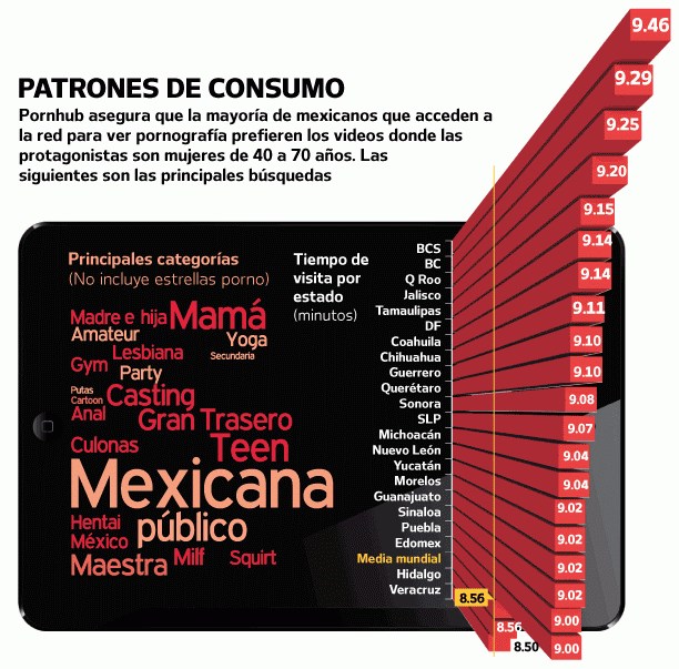 • El tiempo aproximado que pasa un mexicano en un sitio porno es de 9 minutos; en Estados Unidos es de 10 min.