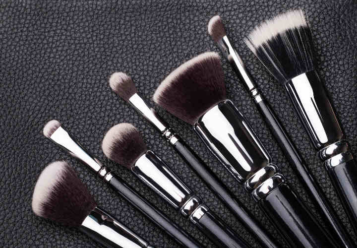 Set of professional makeup brushes over black leather background