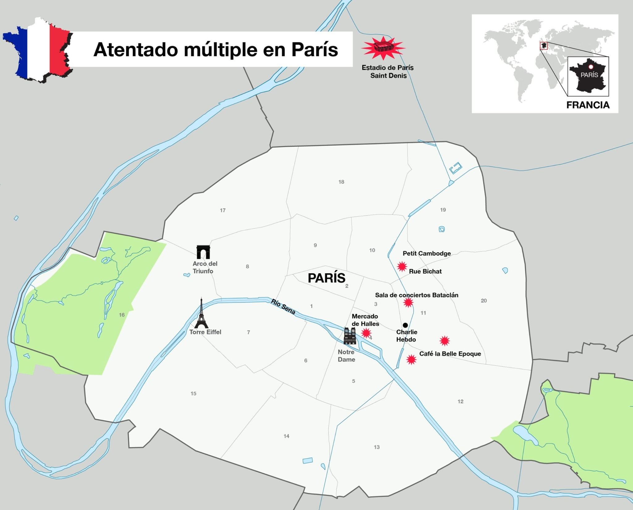 - ISIS ya asumió la responsabilidad de los atentados: ocho militantes de ISIS que llevaban puestos cinturones explosivos y estaban armados con ametralladoras atacaron blancos elegidos con precisión en la capital francesa.