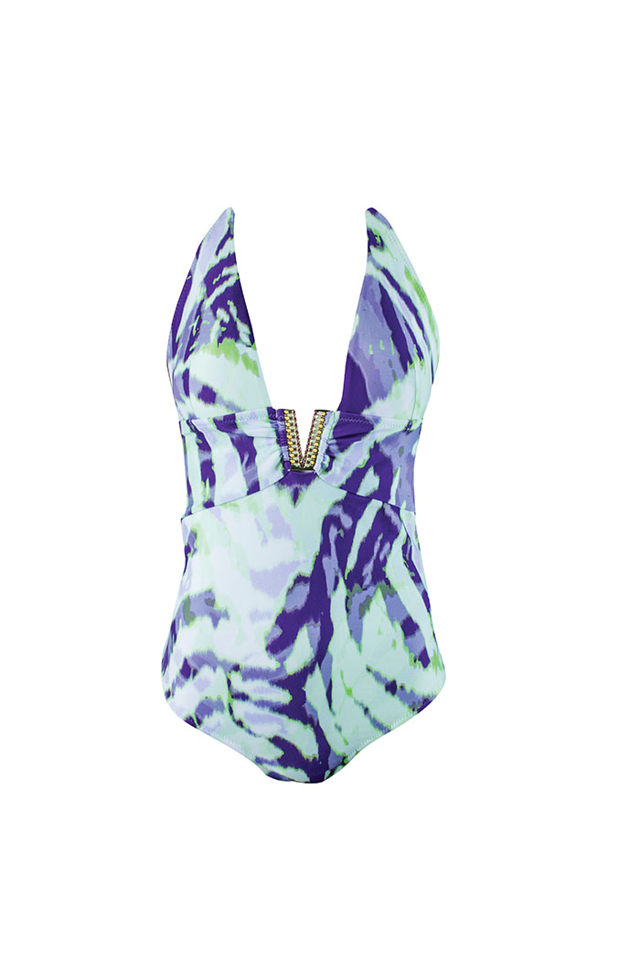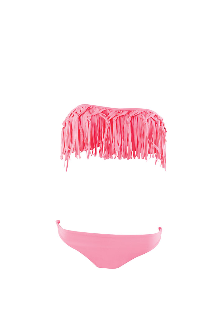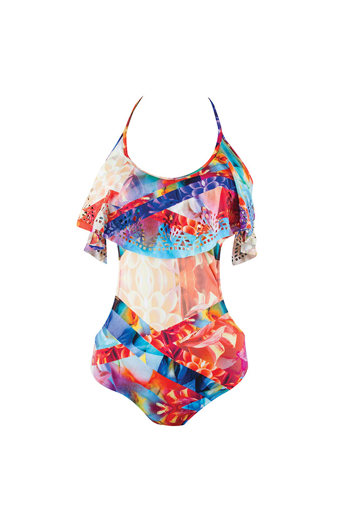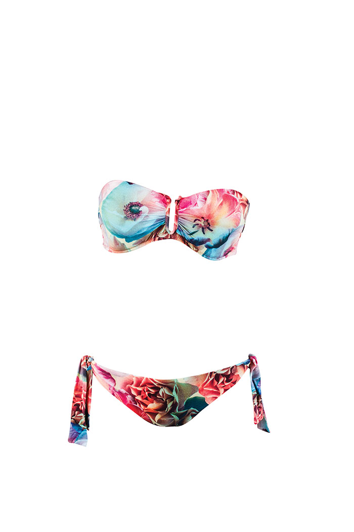 – También bikinis con tiras atadas a los costados o trajes de una sola pieza con estampados florales y volados.